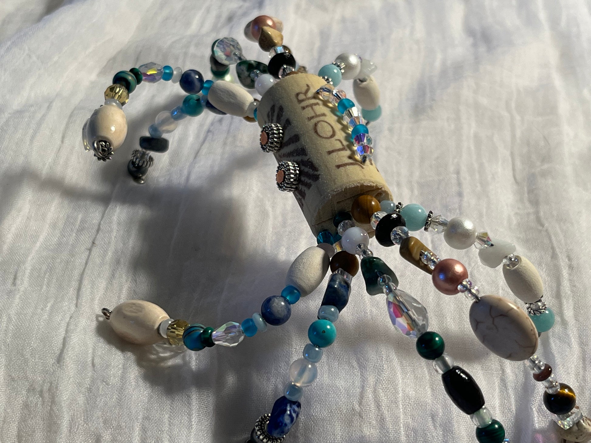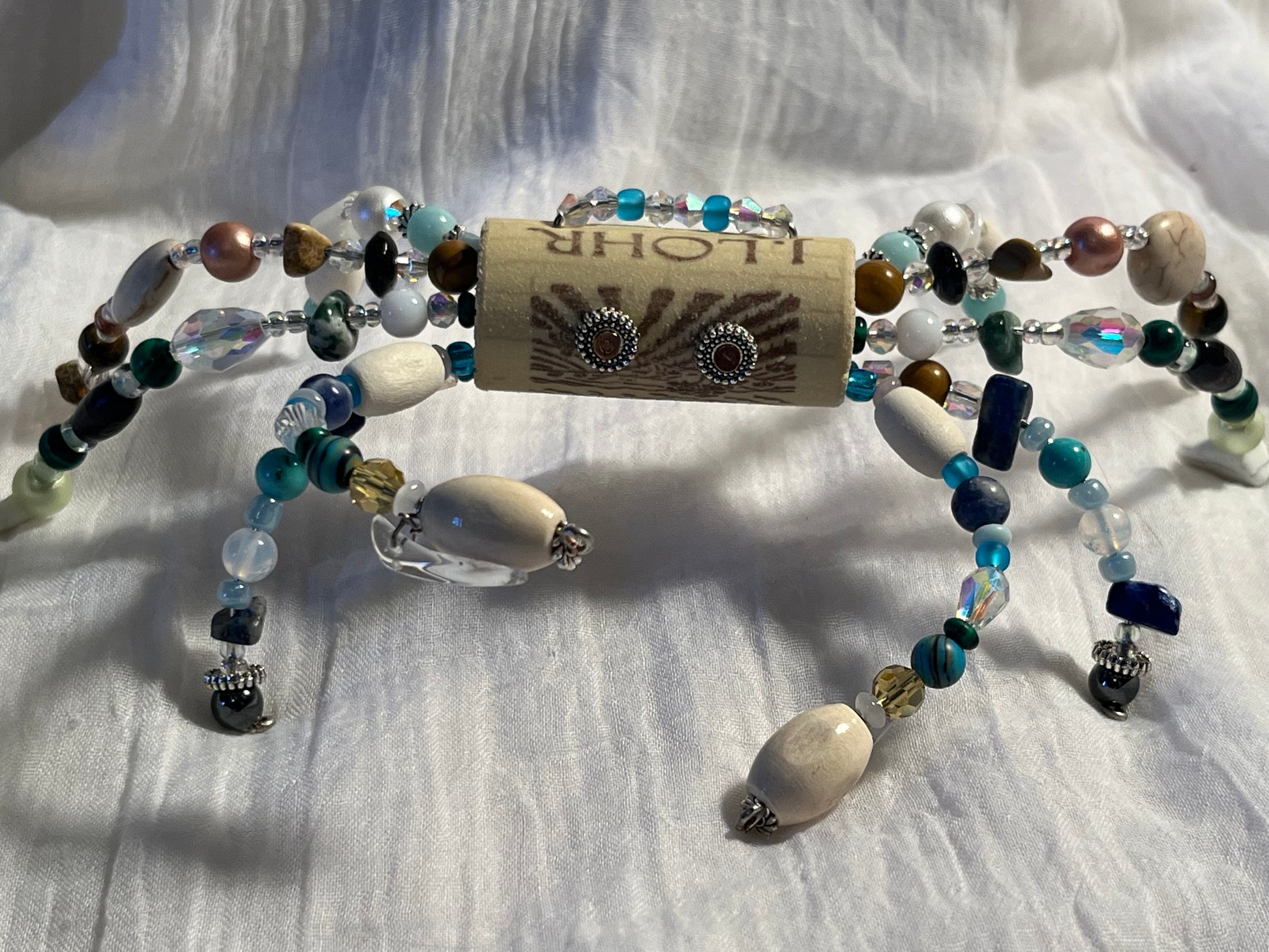 Handcrafted sea life ornaments featuring upcycled beads paired with natural wine cork bases. Each creature showcases thoughtfully coordinated color combinations that bring coastal charm to any space. Perfect for ocean lovers, collectors, or as unique gifts that celebrate sustainable craftsmanship and whimsical design.