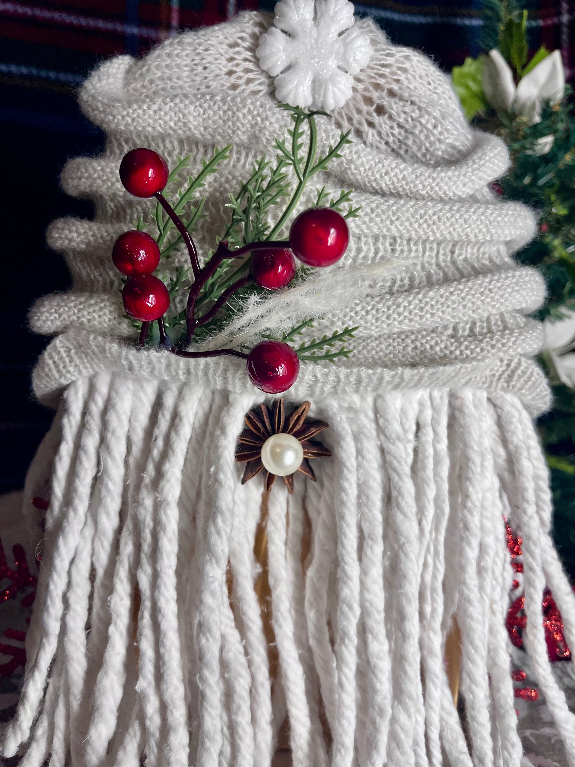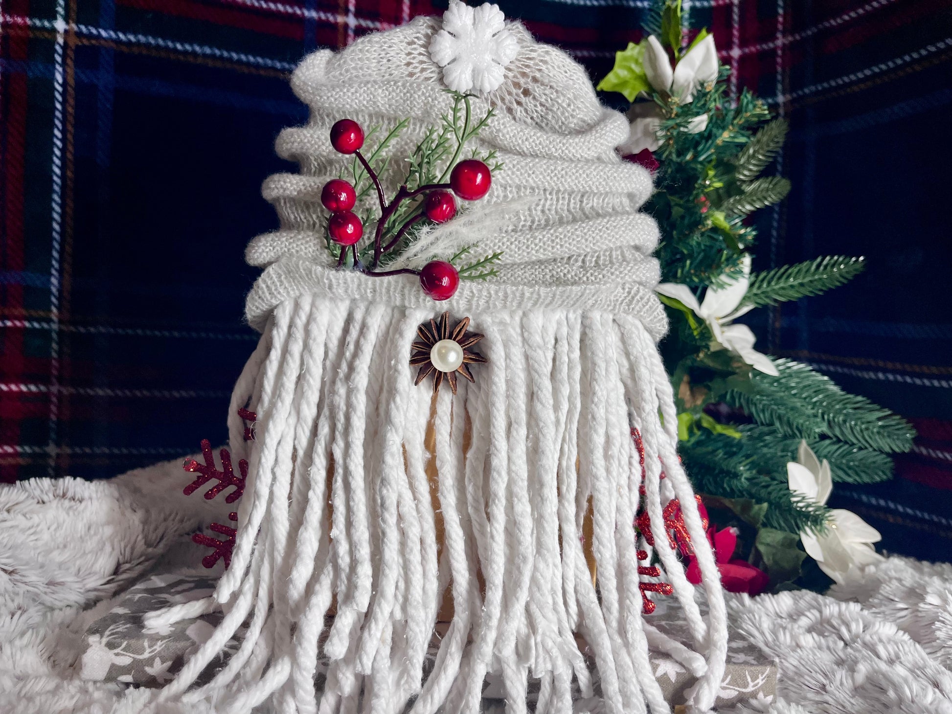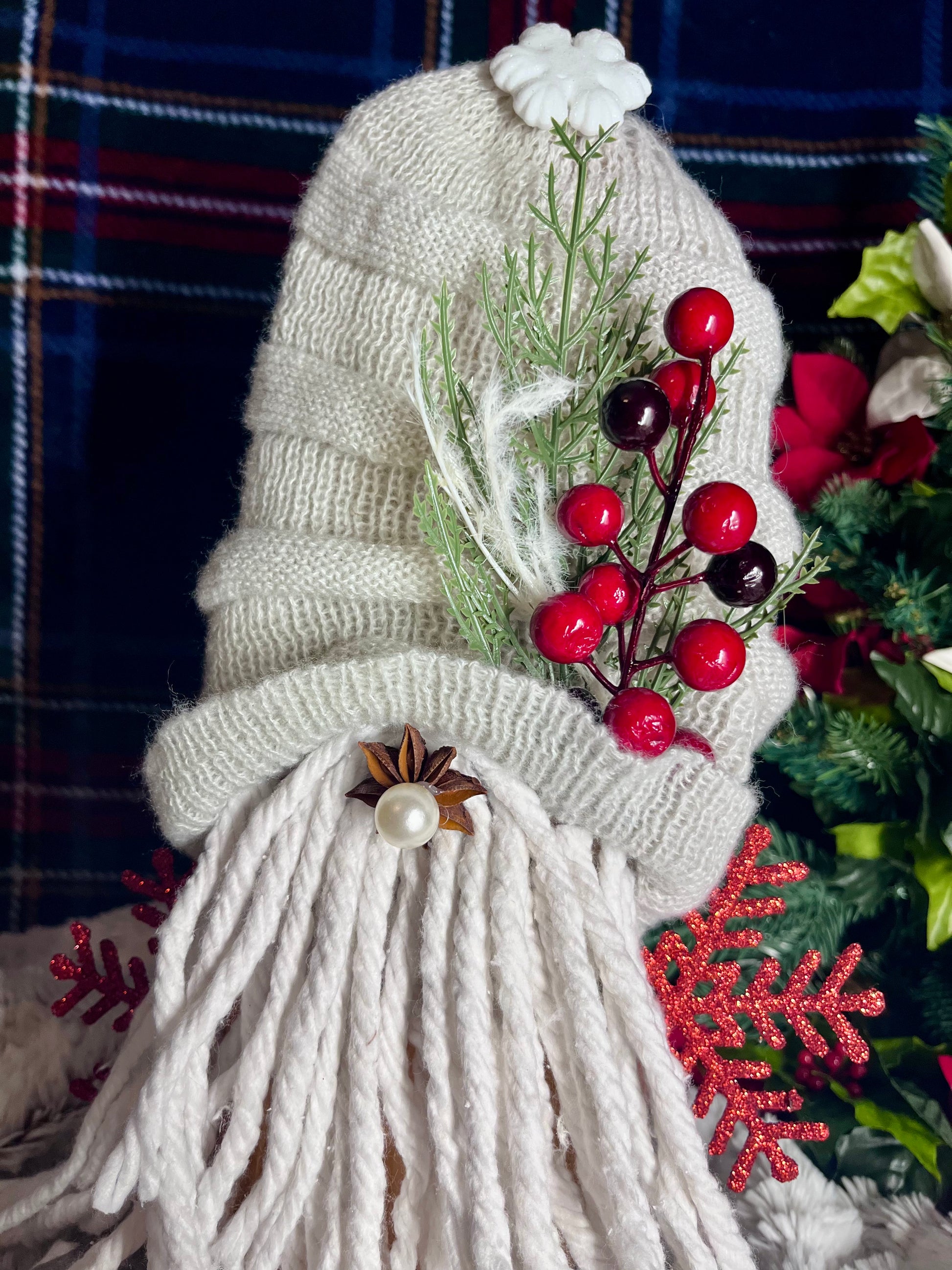 Our gnomes are handmade, one-of-a-kind pieces, created through up-cycling or recycling older objects. These are made of recycled wood planks, various fabrics and thrift clothes. They have mop beards, a red snowflake arms to bring in some sparkle, and a neutral stag pattern base.