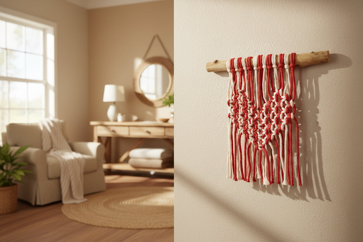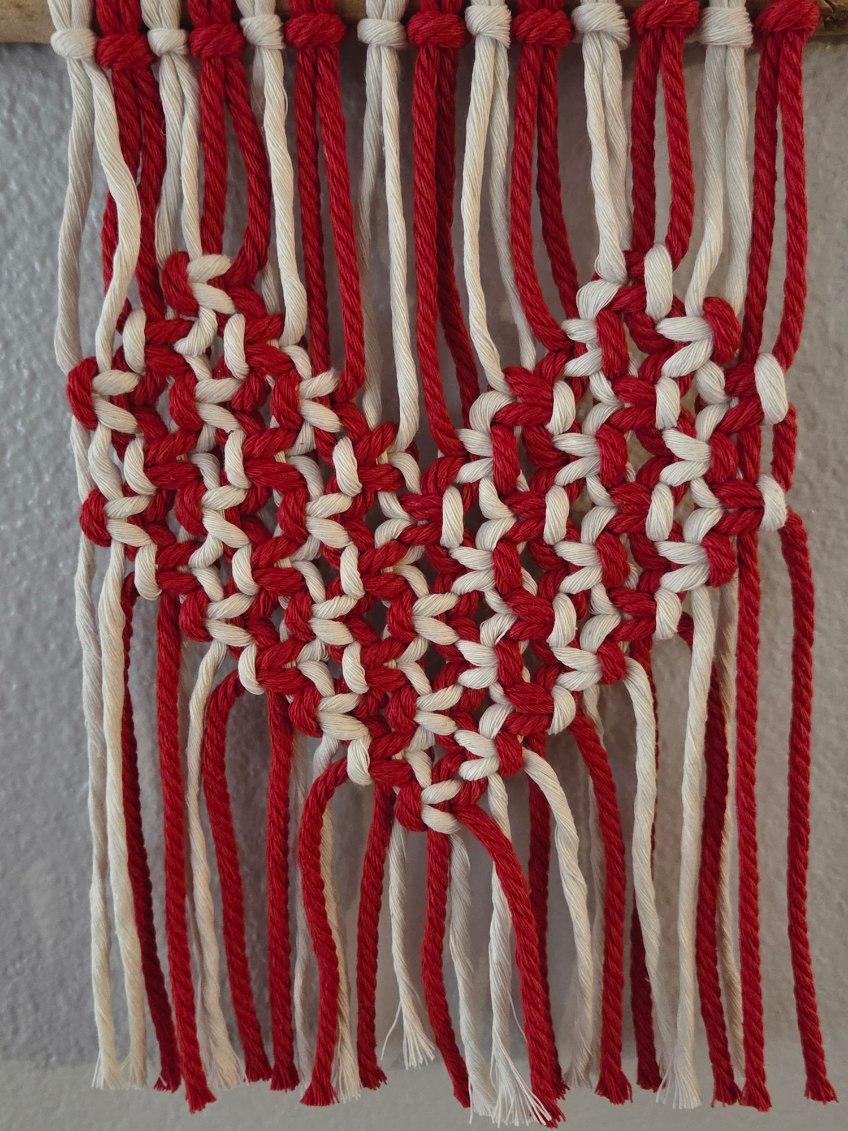 A two-toned heart wall hanging piece adds a simple but sweet charm wherever it is hung. Attached to a piece of Florida driftwood that measures 14” wide with a total length of 19.5”. It is hand knotted using 100% cotton beige and red macramé rope. Hang this in any room to add an endearing ornament to your everyday or Valentine décor.