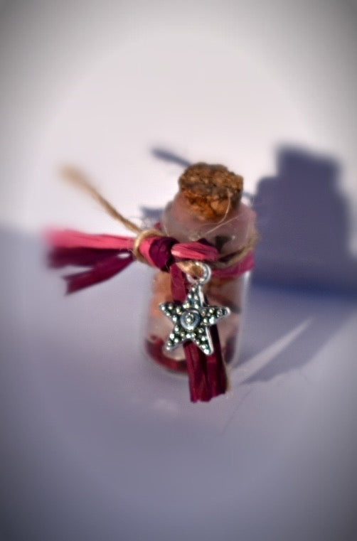 Communication Extra Small Spell: Lapis Lazuli, Citrine, Chrysanthemum, Baby's Breath.Communication Extra Small Spell: Lapis Lazuli, Citrine, Chrysanthemum, Baby's Breath.Our extra small little spell jars are hand crafted to bring you the ability to achieve your goals of manifestation and the power of positive intent. This is a glass bottle, approximately 2ml, with cork stopper. The stopper is sealed with the appropriately colored wax to make it complete.