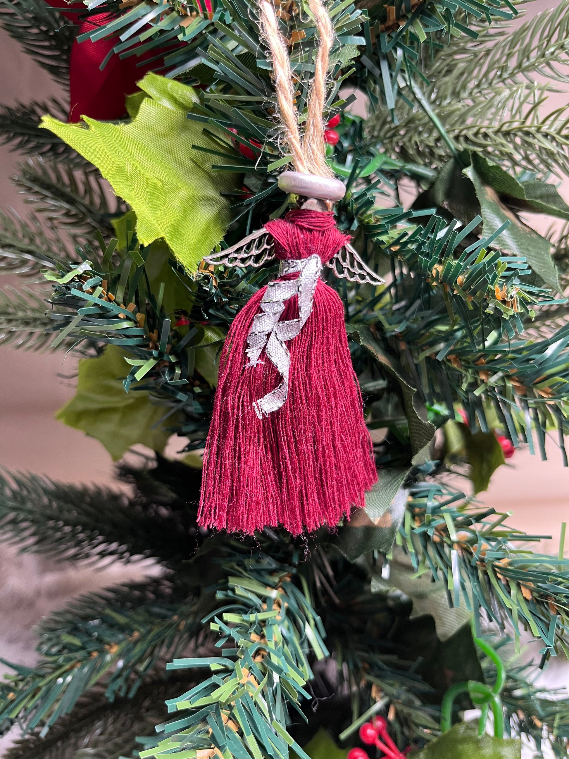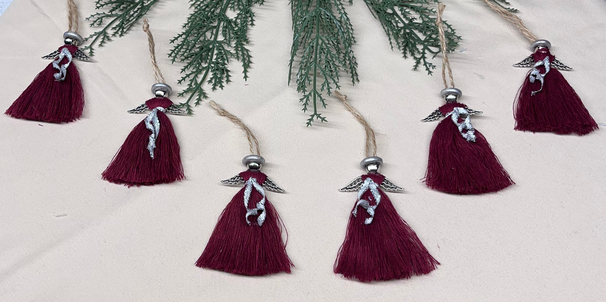 - Silver Wing Macrame - These precious things are made of a silver wing bead, macramé cord, and a bell with wooden halo. Each one is adorned with a delicate silver belt. This is a set of 6.