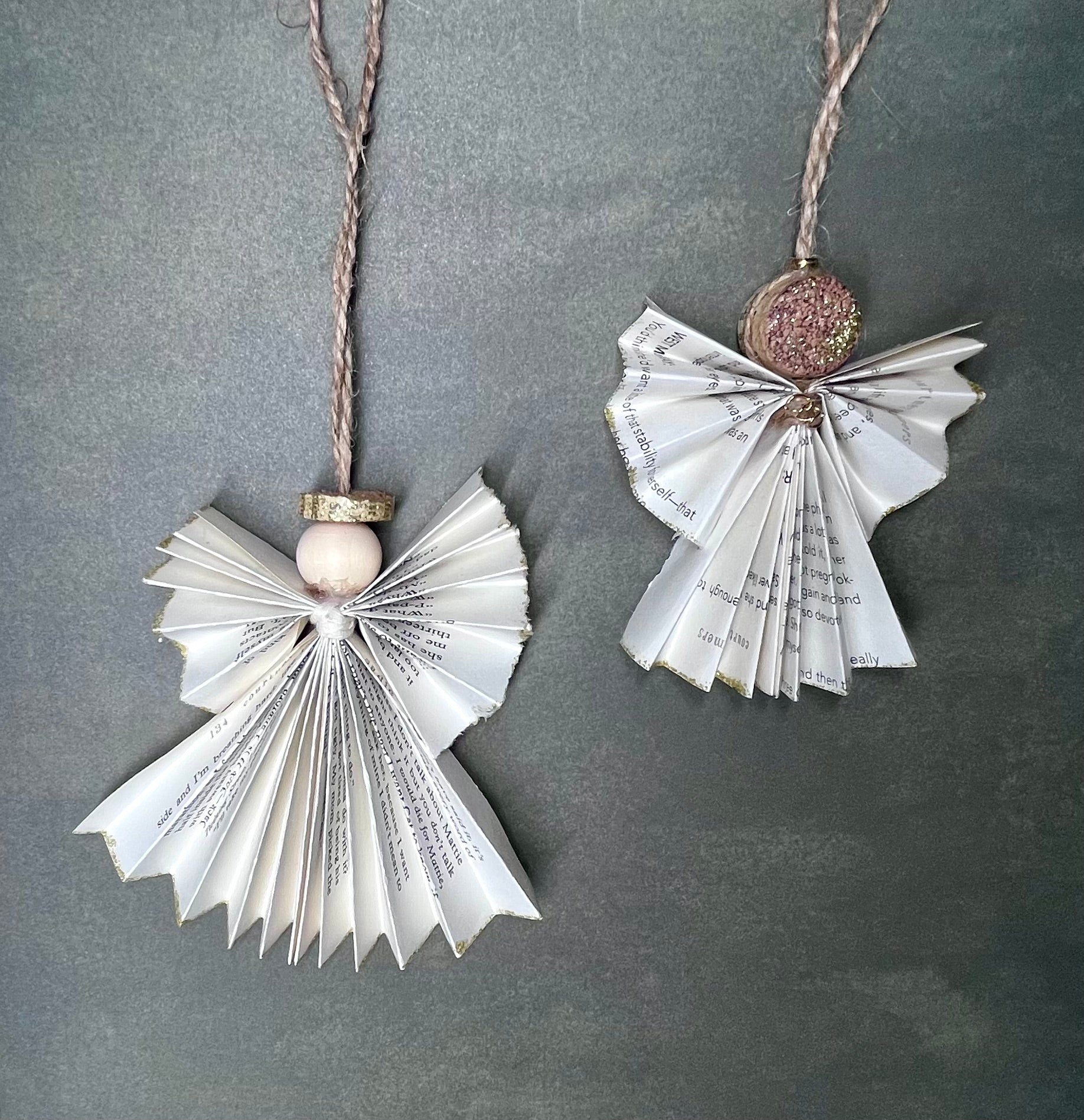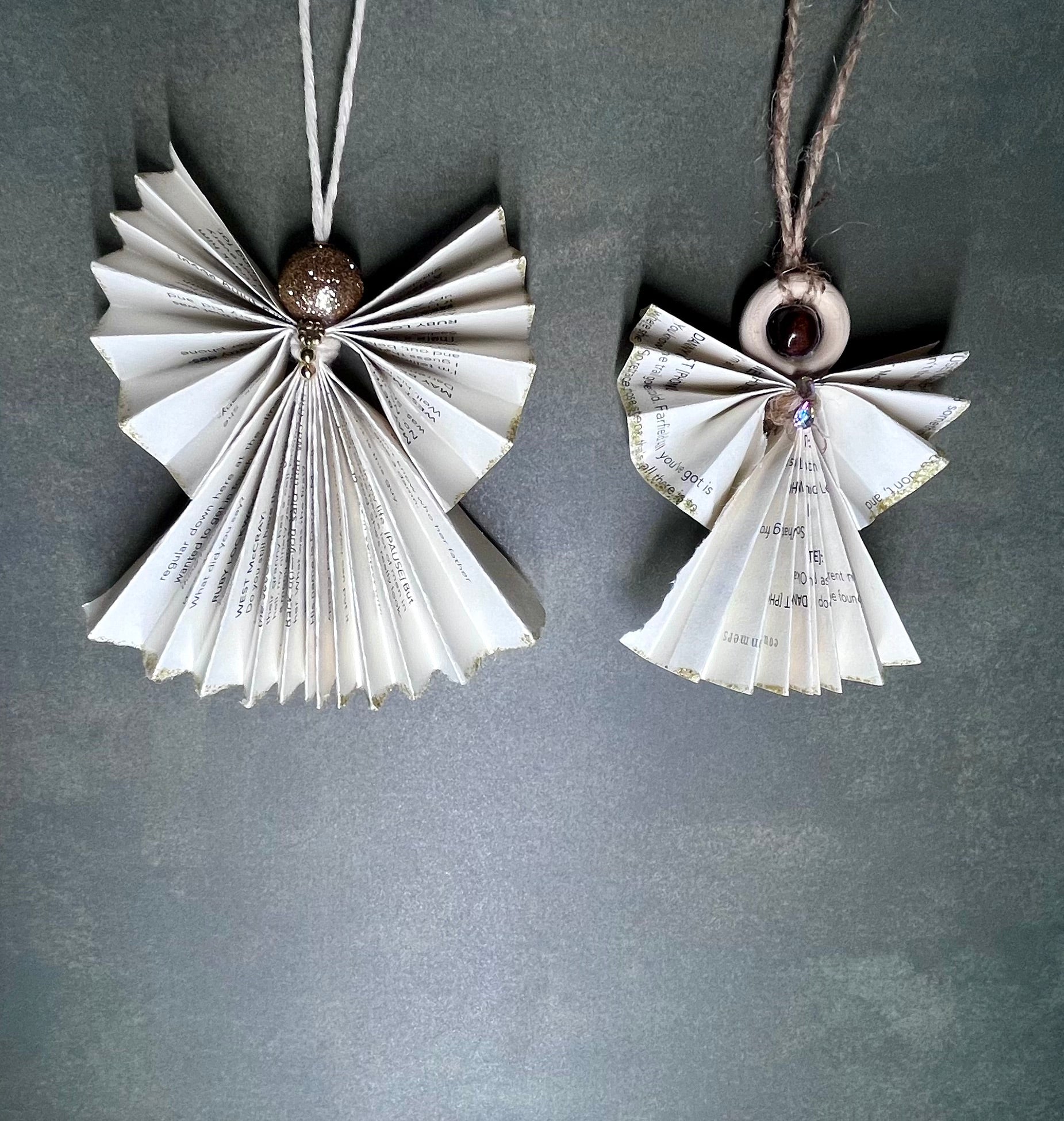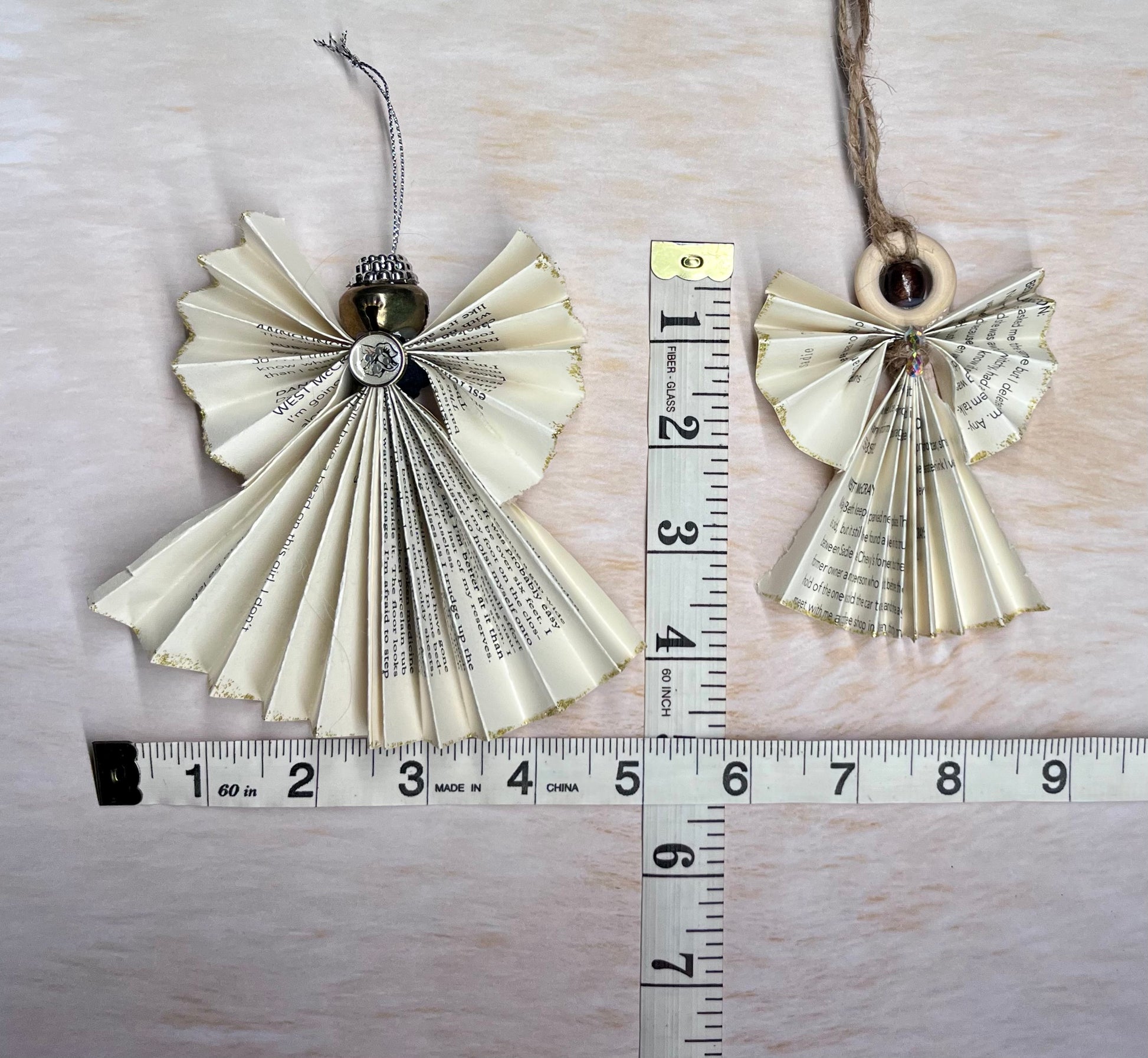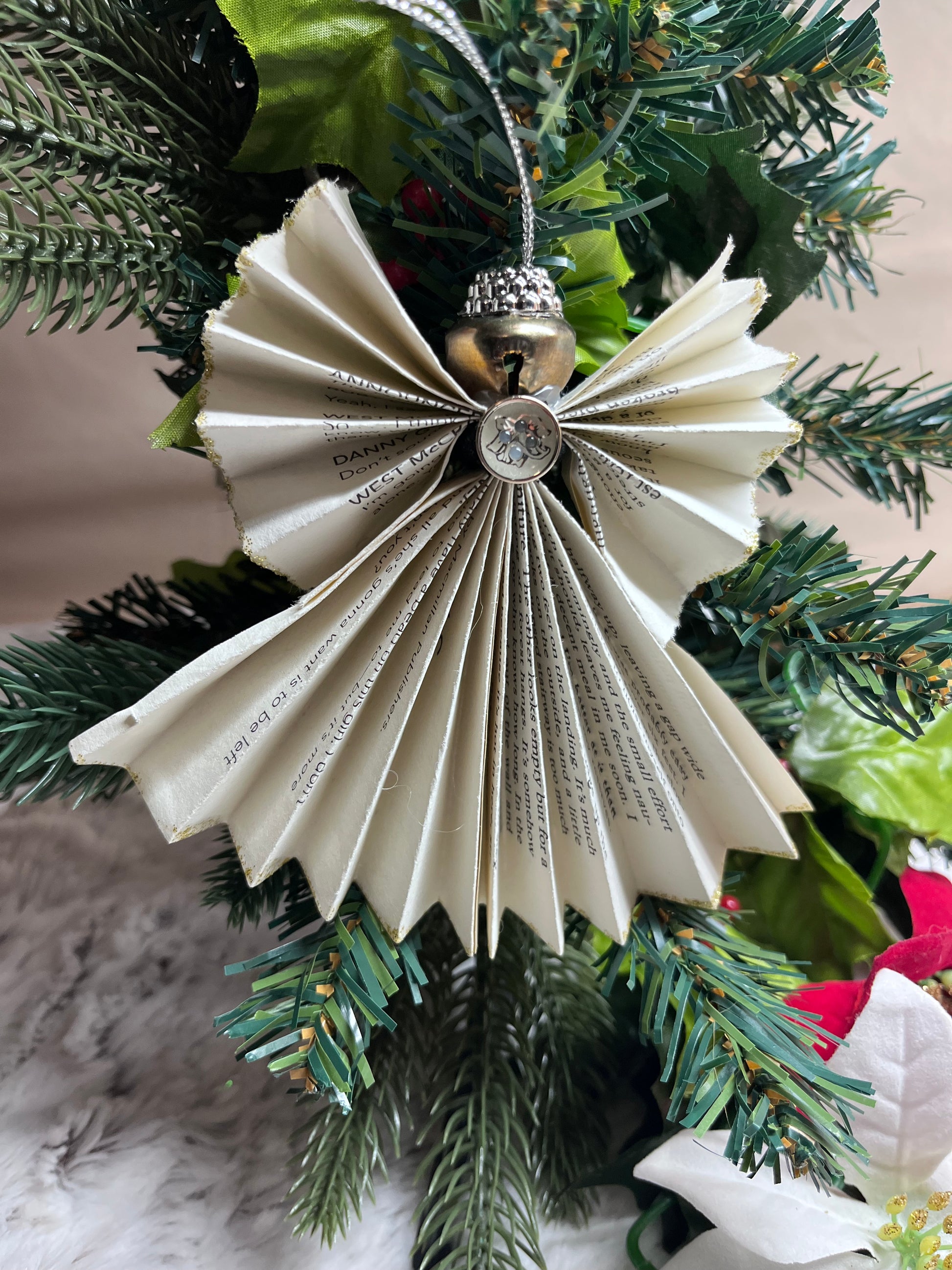 - Book Angels - These are cleverly crafted from the pages of an old book. These are 5" x 5" or 4" x 3". They come as a set of 4 of each scene; Bell & Button (4 Lg), Gold Ball (2 Lg & 2 SM), and Beaded (2 Lg & 2 SM).