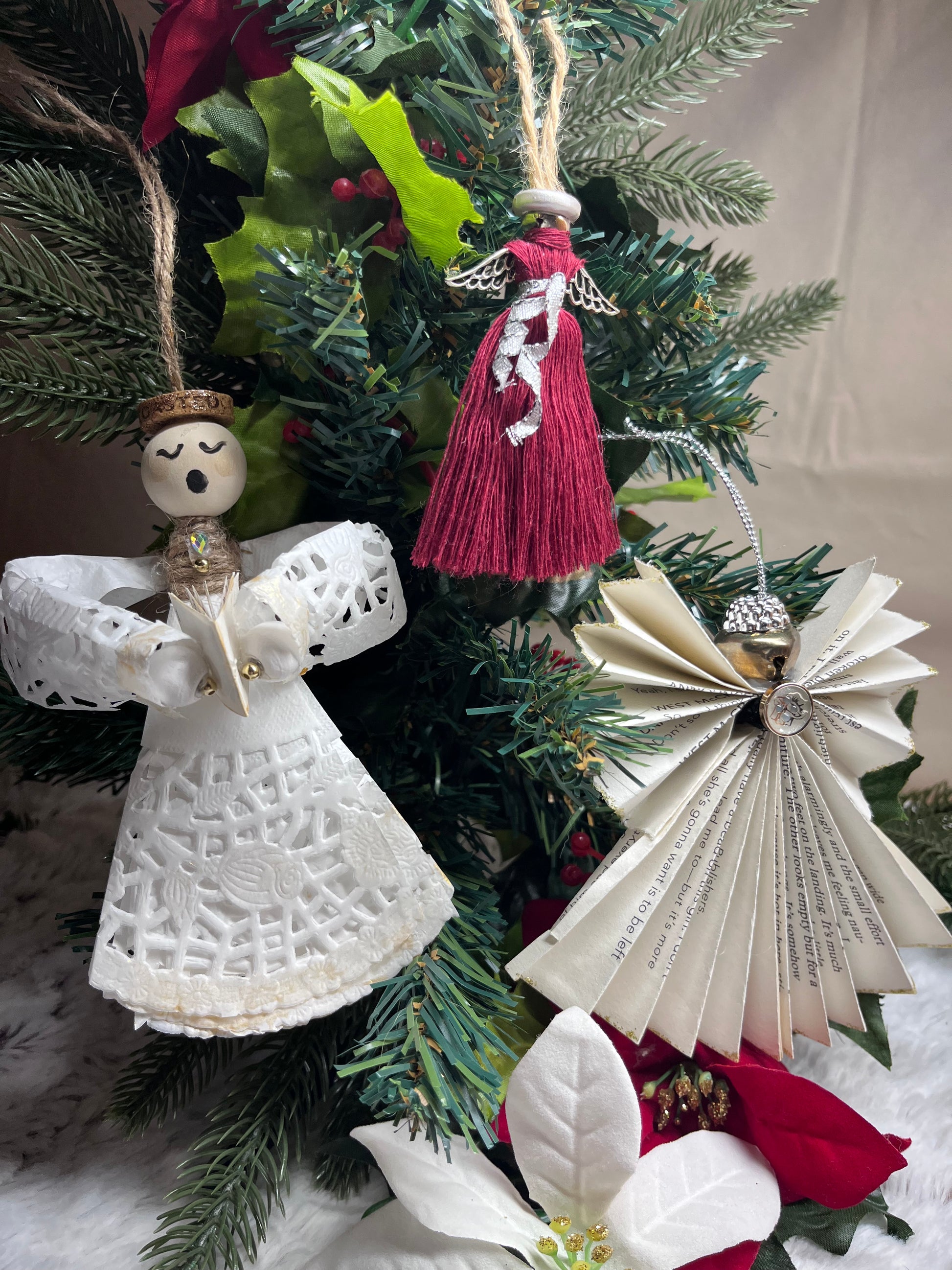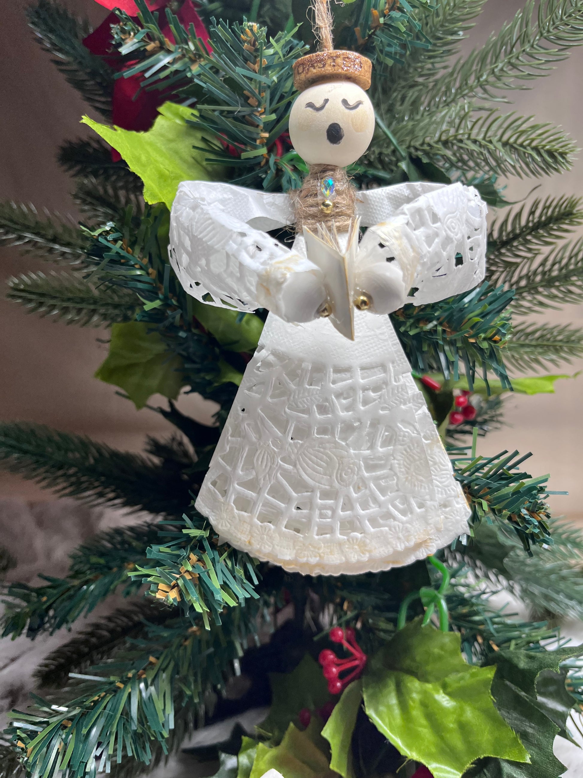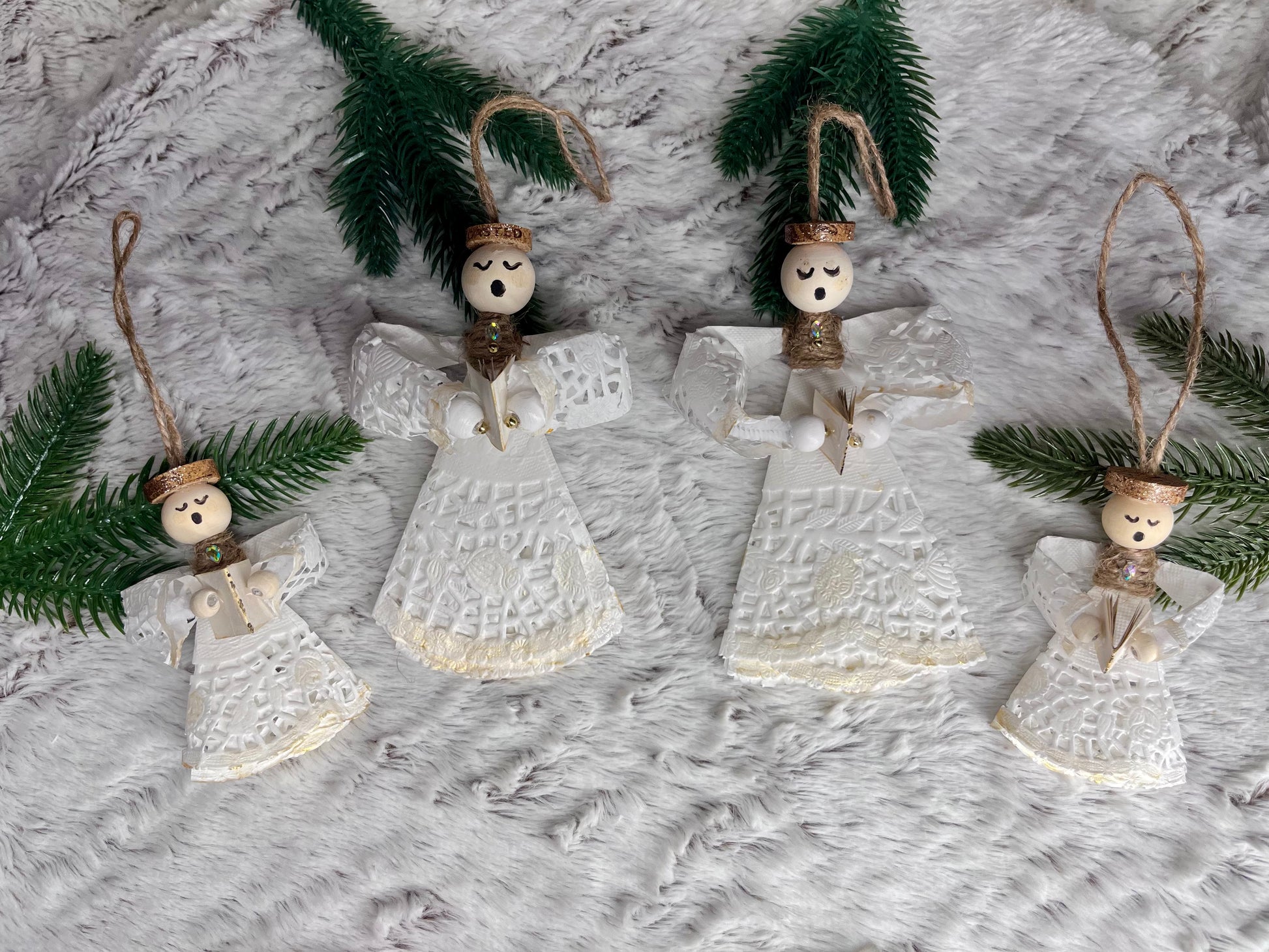 - Paper Doily Angel - Made from white holiday paper doilies, and beaded heads. They have a cute little quark halo and are holding a book. These are 6" x 4" or 4" x 2.5" . They come as a set of 4.