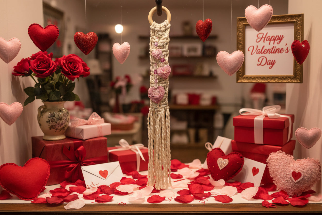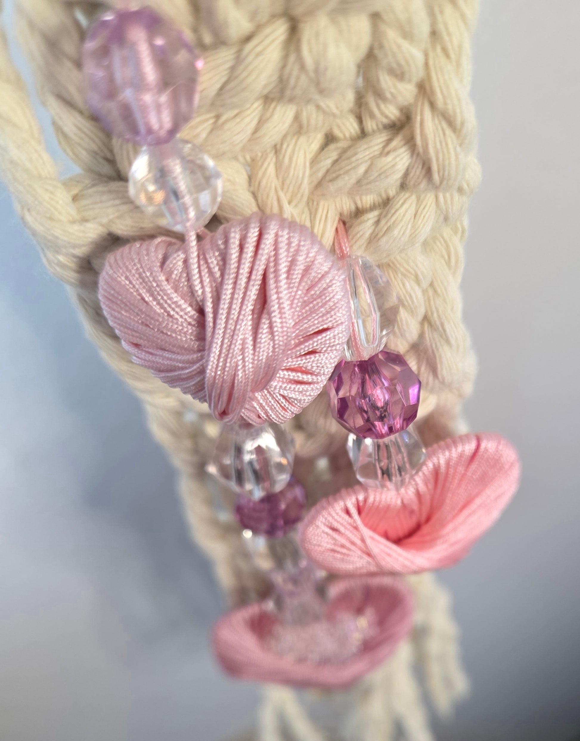 This three-heart macramé wall hanging that is about 12.5 inches in length and about 2 inches wide. This is a hand crafted decorative piece with a romantic, minimalist charm. Not just for your Valentine, this would be a lovely charm for any room all year round. The main macramé piece is made from 100% cotton beige macramé rope. The three hearts are wooden hearts wrapped with pink nylon cords and adorned with glass beads.