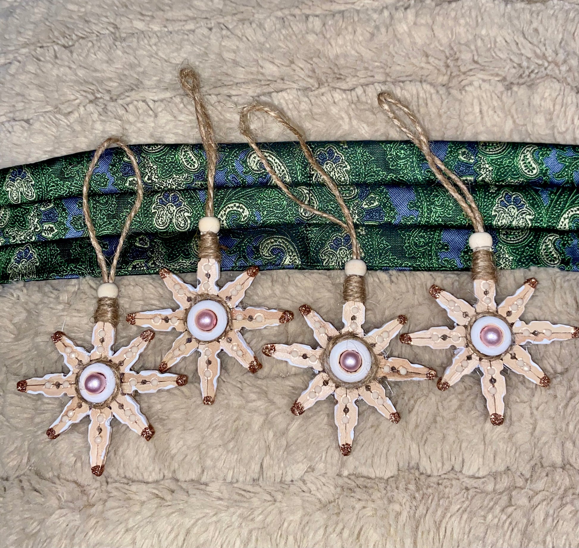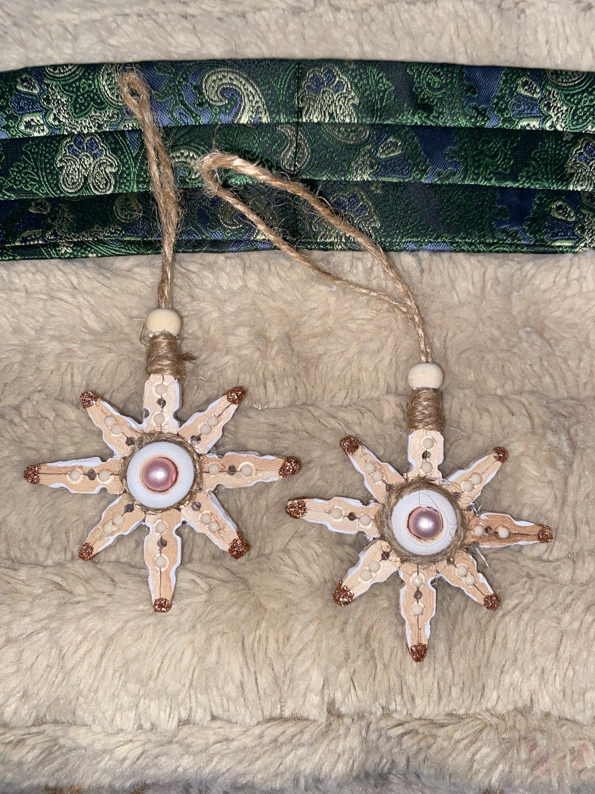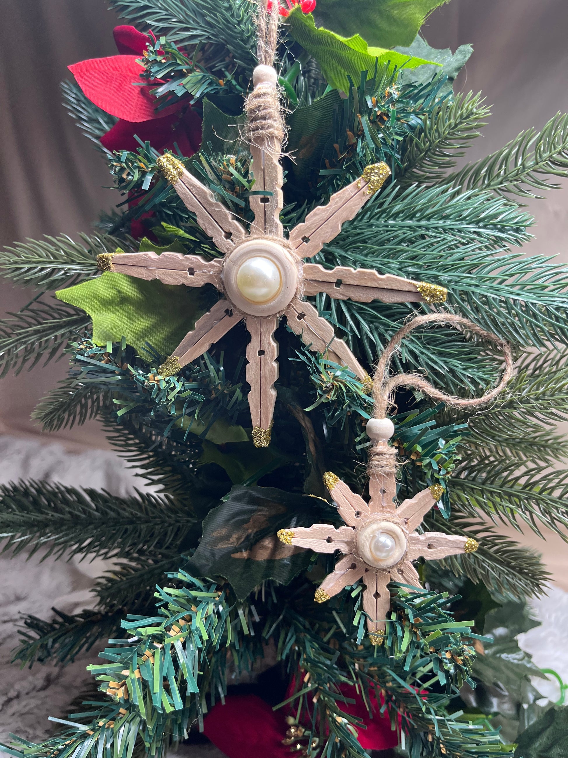 - Wooden Pins- Made from the long forgotten clothes line pins never used! I Love that the wood makes its own patterns in each of the snowflakes. These are 6" (Lg), 4.5-5" (Md), and 3-3.5" (Sm). They come as a set of 2.
