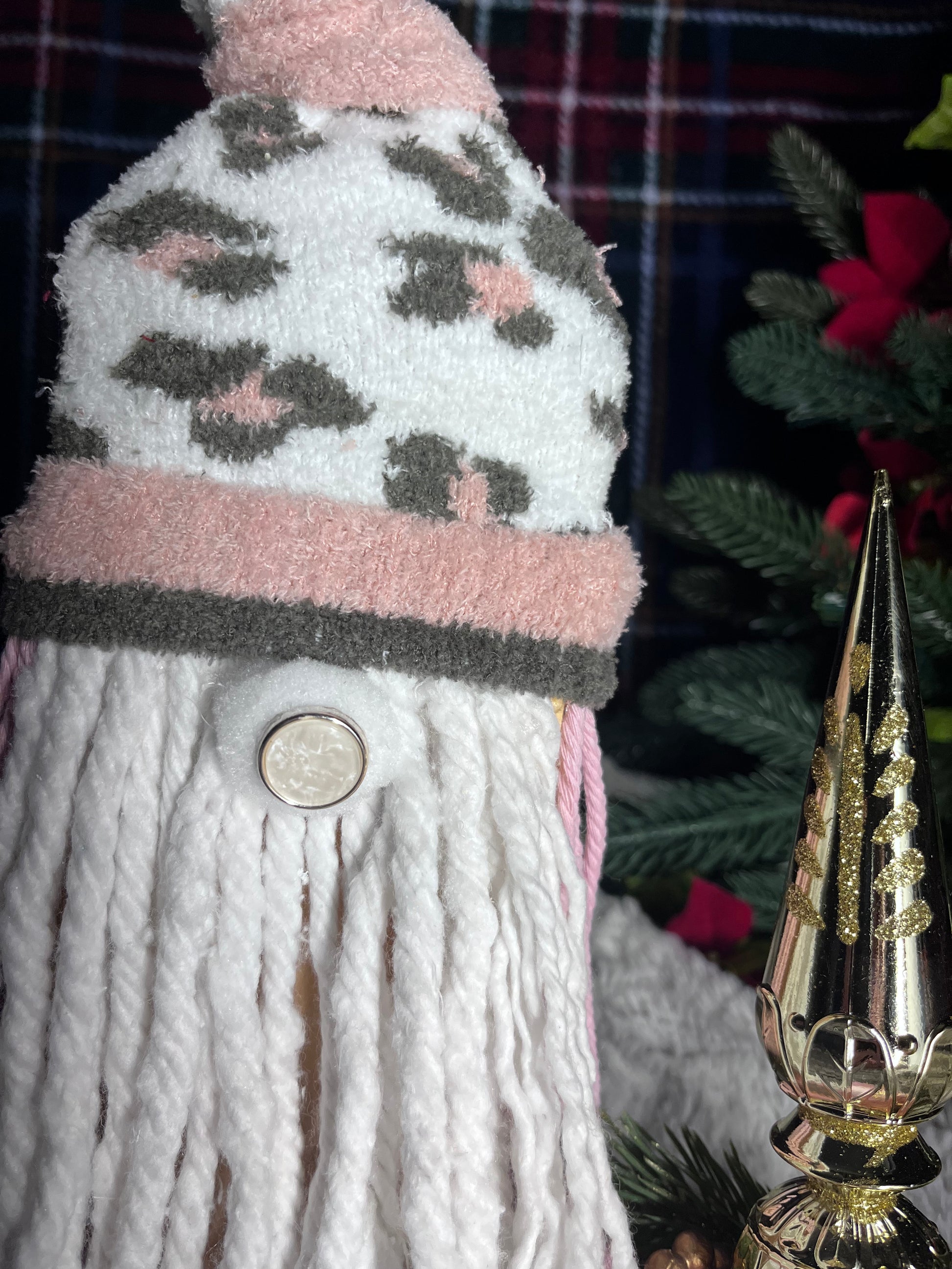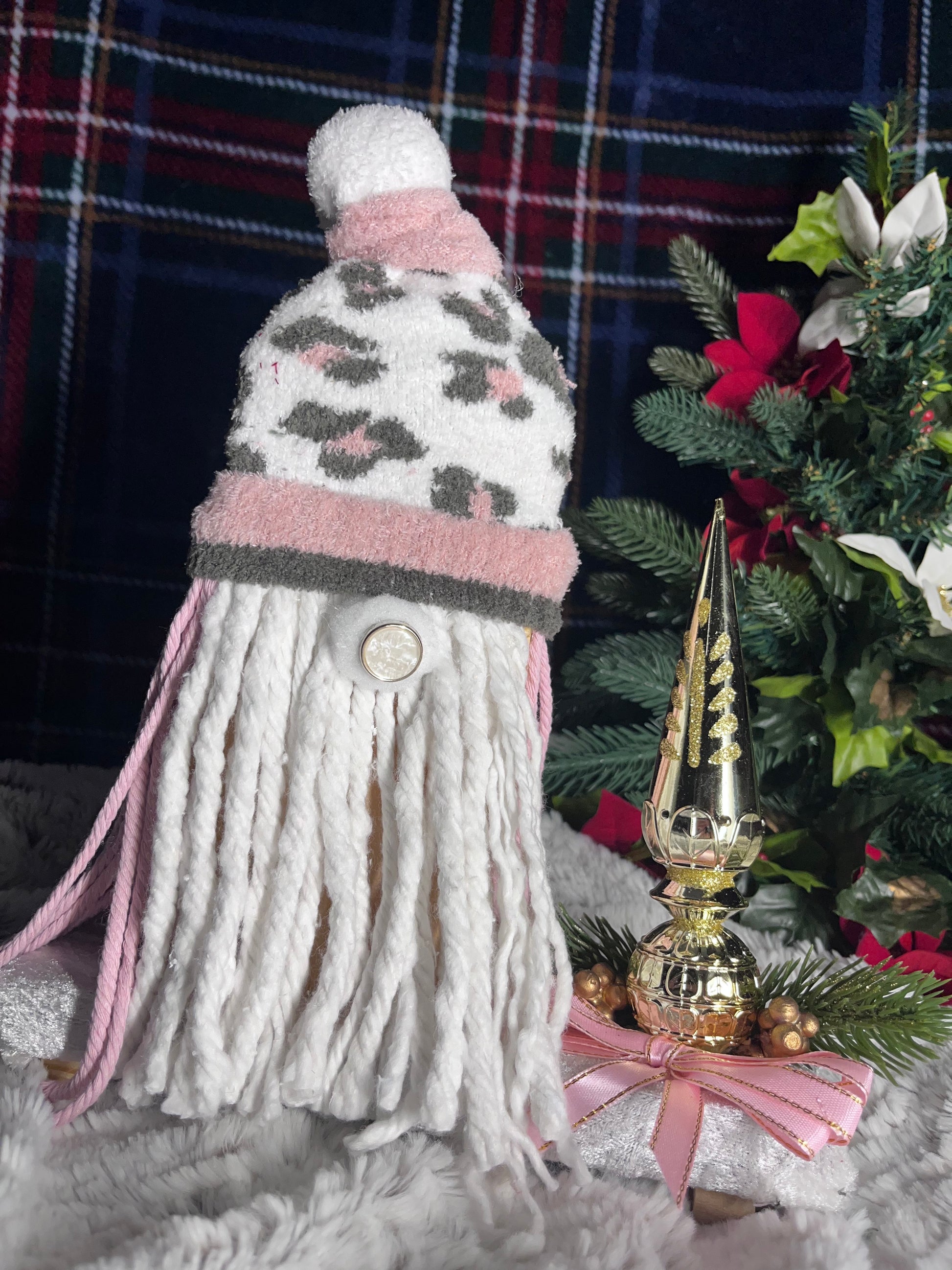Our gnomes are handmade, one-of-a-kind pieces, created through up-cycling or recycling older objects. These are made of recycled wood planks, various fabrics and thrift clothes. They have plush pink as the theme with hats and matching hair, these are on a white velvet base.